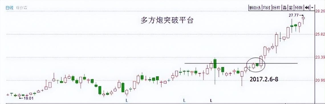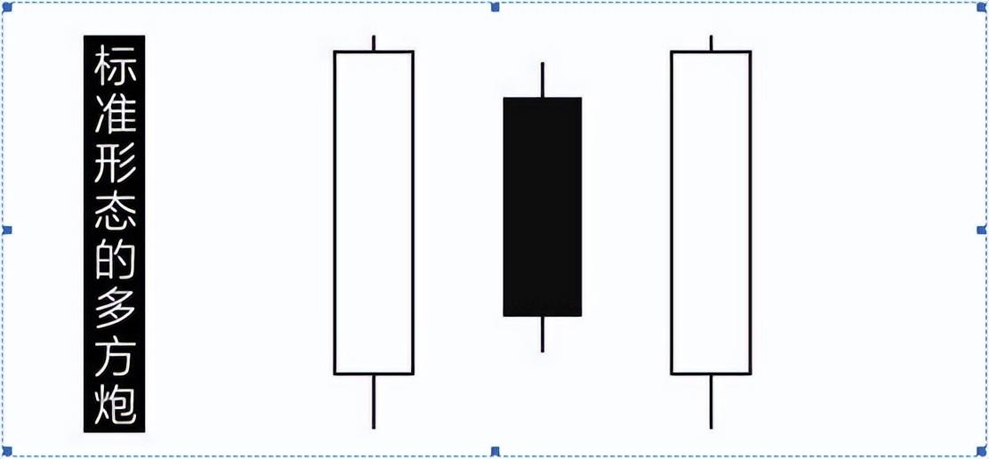 1、标准形态下的多方炮,即从底部盘整平台向上突破时出现的两根阳线夹一根阴线的三根K线组合。